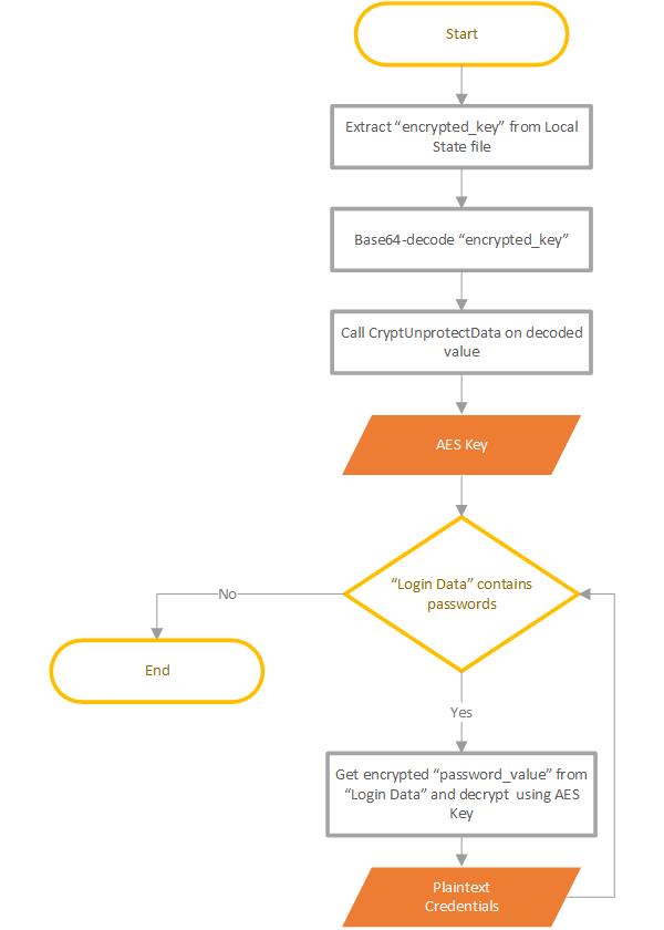 The above analysis is a large amount of information to process, though it is quite extensive and documents the inner workings of Chromium. There are multiple layers of abstraction which can be confusing to parse through. If you are looking for the “shortcut” answer as to how it works, look no further. These steps are a high-level overview of how to obtain plaintext browser credentials from the browser’s credential store.