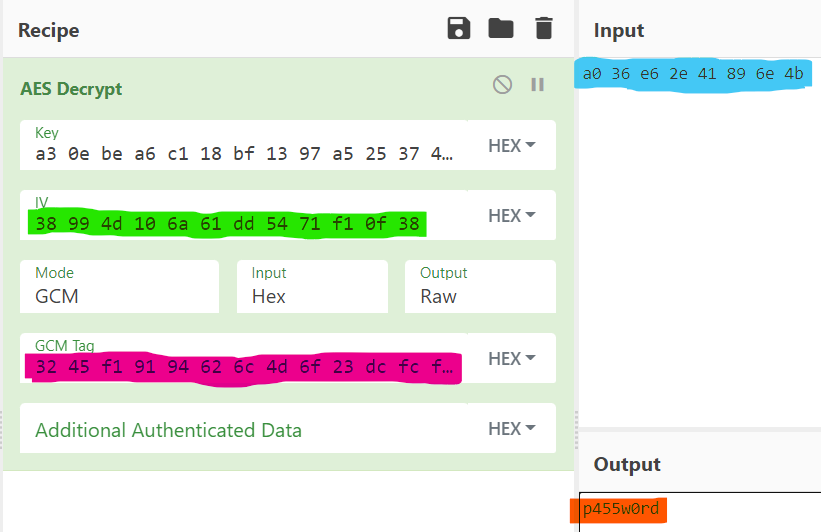 Running the Python script gives us the key a30ebea6c118bf1397a5253742eff809c55541eb4b32aca5aa291714a2f00054. Inputting all of the information gathered into Cyberchef using the AES Decrypt recipe yields the plaintext password highlighted in red-orange. This process can be applied to any password_value in the logins table to extract all stored credentials or any encrypted_value in the cookies table (Cookies database) to extract all stored cookies.