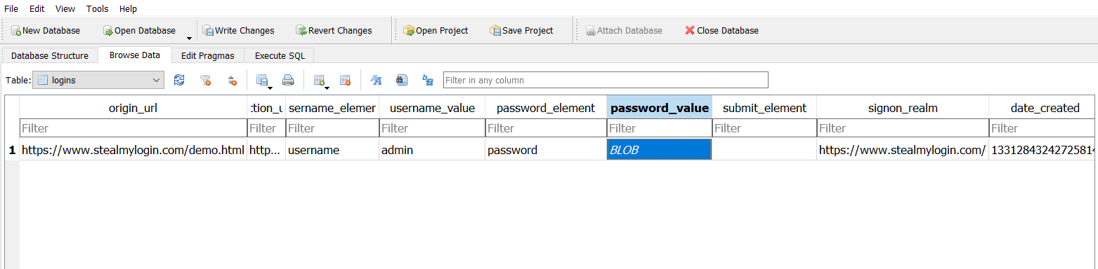 Now that we know how Chromium does it, how can we decrypt data from the password store in a Chromium-based browser? First, let’s take a look at the SQLite Database that contains the credentials, %LOCALAPPDATA%\\Google\\Chrome\\User Data\\Default\\Login Data, using DB Browser for SQLite. Notably, there is a table in the database called logins which is comprised of data including the origin_url, username_value, and password_value.