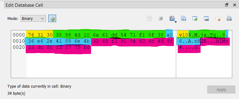 Taking a deeper look into an individual password_value entry in the logins table, we observe that it is possible to manually parse the information in the same way OSCryptImpl::DecryptString does.