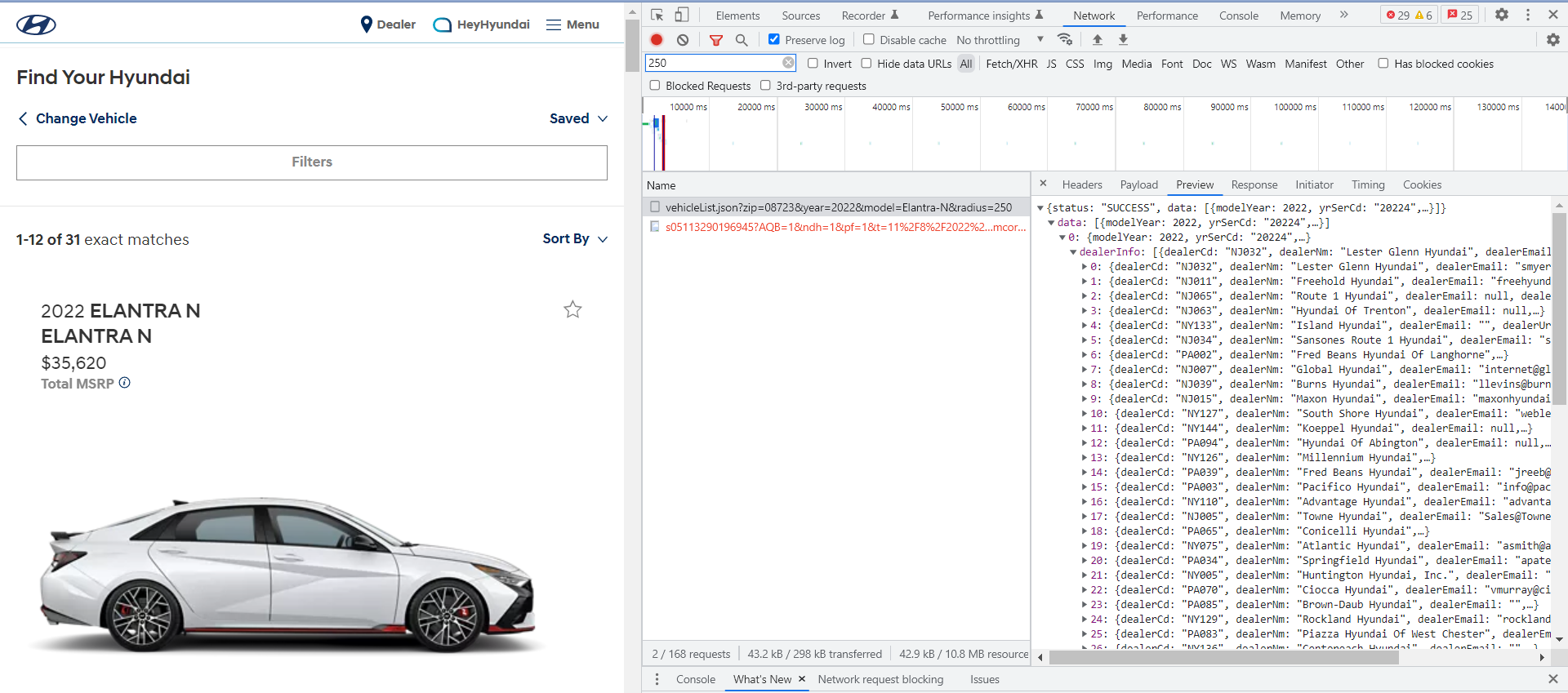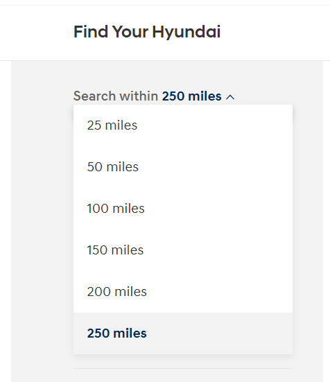 Upon visiting the Hyundai USA website, I went to the “Inventory” section to see what my options were. However, the website only gives a maximum search radius of 250 miles. Unfortunately, in today’s market, consumers may need to travel in excess of that in order to find a vehicle without unnecessary markups. In order to efficiently discover inventory outside of that search radius, I needed to figure out how the site was getting the information it displays to the user.